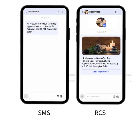 Transform plain texts into dynamic experiences complete with images, videos, buttons, carousels, and quick replies. Drive higher engagement and create visually appealing, branded conversations right inside the user’s default messaging app.